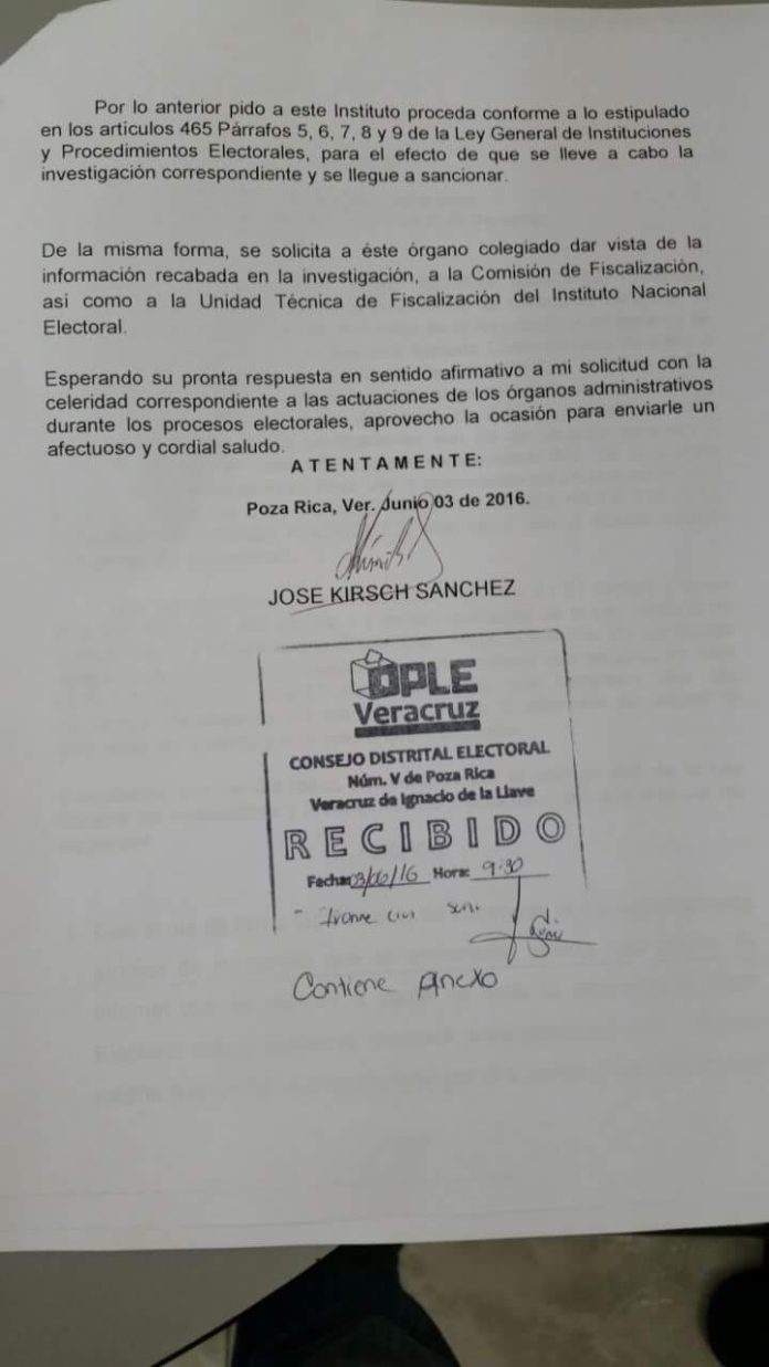 Al respecto José Ramírez, representante propietario del Partido de la Revolución Democrática en el quinto consejo distrital y el coordinador de la campaña Abelardo Aguirre Guerrero, señaló que ya se ha interpuesto una denuncia ante la Fiscalía del distrito con carpeta de investigación UIPJ/PZR6/1444/2016, con el objetivo evitar delitos electorales en agravio a el candidato Pepe Kirsch, así mismo del mismo proceso electoral.