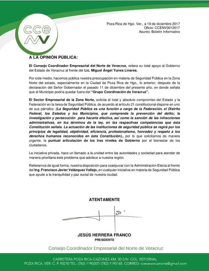El Consejo Coordinador Empresarial de la Zona Norte de Veracruz, reitera su total apoyo al gobierno del Estado de Veracruz al frente del Lic. Miguel Ángel Yunes Linares.