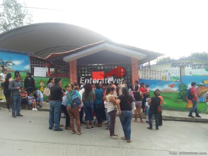 Padres de familia del kínder María Pape Carpentier exigen a las autoridades la asignación de dos maestros nuevos, ya que los docentes anteriores fueron jubilados desde el mes de octubre del año pasado, por lo que han tenido que pagar con recursos de la escuela durante 4 meses y medio a un educador externo para que imparta clases a sus hijos.