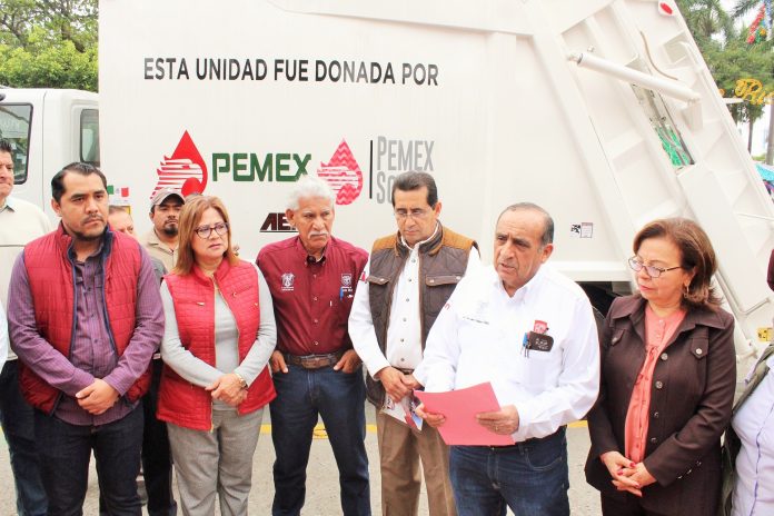 Acompañado de Rigoberto Núñez Solís, Enlace de la Gerencia de Responsabilidad y Desarrollo Social de PEMEX zona Golfo, Velázquez Vallejo agradeció a la empresa Petróleos Mexicanos (PEMEX) por la donación que este día realizó de un camión recolector de basura a través del Programa de Apoyo a la Comunidad y Medio Ambiente (PACMA).