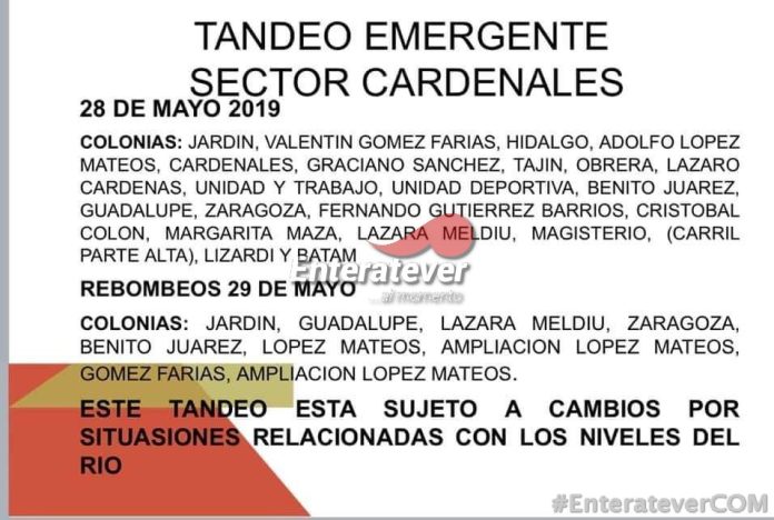 Por su parte, la oficina de la Comisión de Agua del Estado de Veracruz (CAEV) en sus redes sociales de manera periódica a dado a conocer cuáles son los días en que se realizarán los bomberos en diferentes confías de la ciudad.