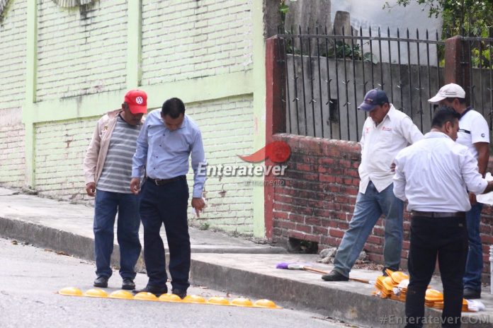 Buscando la disminución de las unidades automovilísticas que transitan sobre la calle salida Gutiérrez Zamora de Papantla, trabajadores del gobierno municipal realizan la colocación de boyas vehiculares.