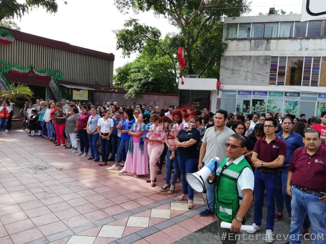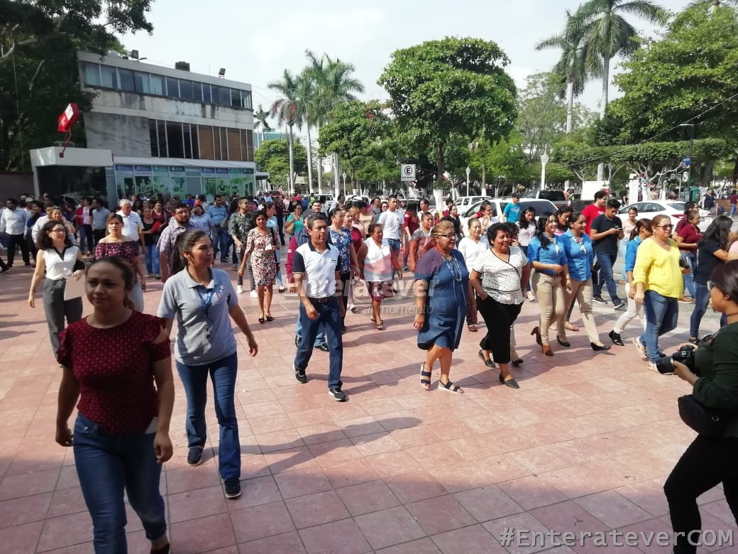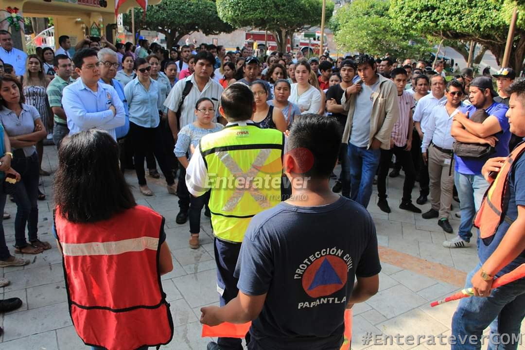 Trabajadores de gobierno participan en simulacro en Papantla, en punto de las 10 de la mañana más de quinientos trabajadores del ayuntamiento municipal salieron de las instalaciones en dirección al parque central de esta ciudad.