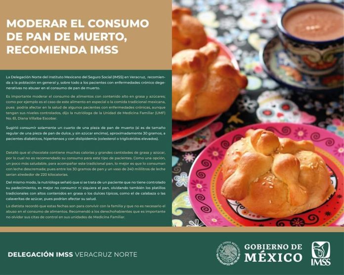 La delegación norte del Instituto Mexicano del Seguro Social(IMSS) invita a la ciudadanía a moderar el consumo de pan de muerto, esto durante un comunicado recalcando a las personas que padecen de una enfermedad crónico degenerativa.