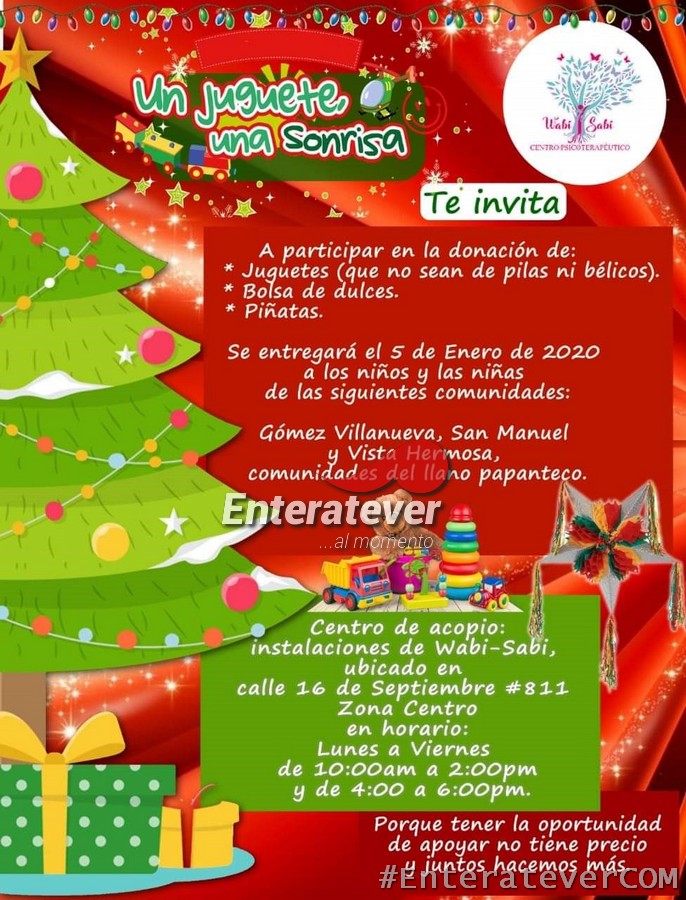 Con la finalidad de poder llevar felicidad durante esta temporada decembrina a los menores más vulnerables del municipio de Papantla, el centro terapéutico Wabi-Sabi, invita a la ciudadanía a participar en la campaña de donación de juguetes.
