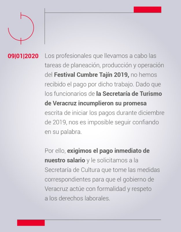 “Exigimos el pago inmediato de nuestro salario y le solicitamos a la Secretaría de Cultura que tome las medidas correspondientes para que el gobierno de Veracruz actué con formalidad y respeto a los derechos laborales”, señala el documento.