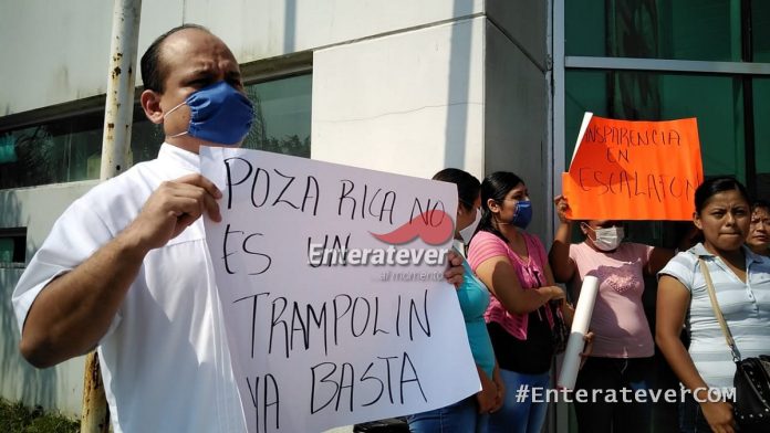 Con pancartas en mano un grupo de 30 trabajadores de la salud solicitan transparencia en la bolsa de trabajo, los manifestantes acusaron al sindicato de convertir al Hospital del ISSSTE de este municipio en un trampolín de todas las unidades de la región norte de Veracruz, pues algunos solo duran tres años y se les otrorga la base y son enviados a otros hospitales y los trabajadores del municipio no se las dan.