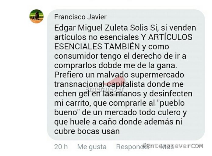 Francisco Javier Velázquez Straffon, aseguró que en los supermercados sí cumplen con las recomendaciones dadas por la Secretaría de Salud por lo que se siente seguro de ir a realizar sus compras, en cambio en el mercado la gente no acata estás indicaciones por lo que se pone en riesgo la vida de todas las personas que acuden a este.