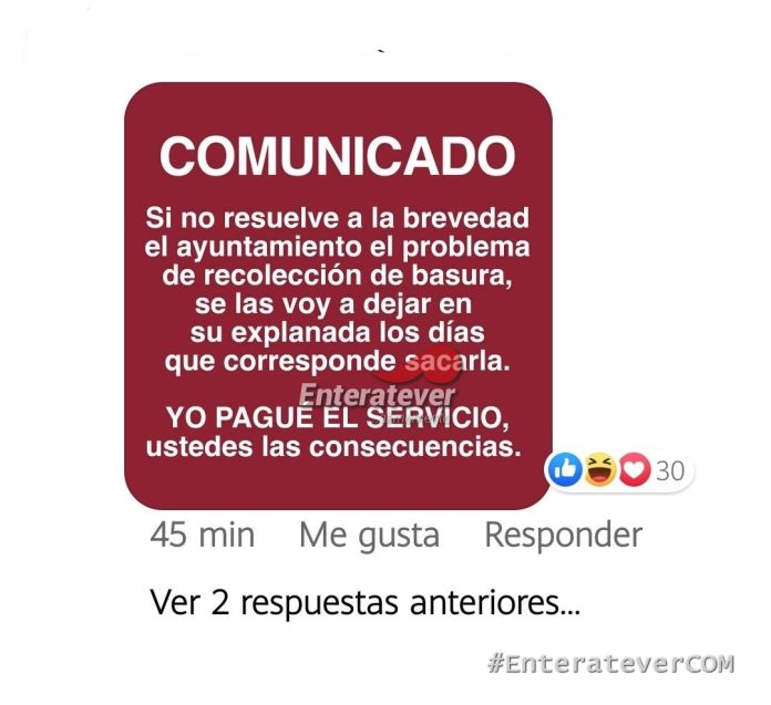 Poza Rica, Veracruz.- Tras darse a conocer que el relleno sanitario fue clausurado ciudadanía lanza campaña para ir a depositar su basura a la explanada del palacio municipal en caso de que no se solucione el problema de la recolección de basura en el municipio, ya que de acuerdo a al comunicado emitido por el ayuntamiento se dio a conocer que se cancela el servicio de recolección de basura.