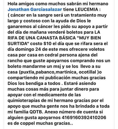 Jonathan García Salazar, originario de la localidad El Cedral, padece de leucemia (cáncer en la sangre), por lo que necesita una serie de quimioterapias para poder superar la enfermedad y al no poder recibir los tratamientos ha realizado un rifa para poder recaudar las cantidades que requiere para una quimioterapia.