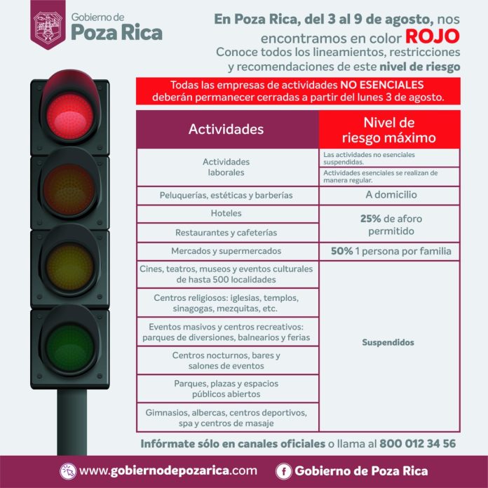 Poza Rica, Veracruz.- Del tres al nueve de agosto Poza Rica estará en color rojo del semáforo epidemiológico, esto de acuerdo con los datos que ha brindando la Secretaria de Salud a nivel Estatal, por lo que a nivel local las autoridades municipales han dado a conocer que seguirán aplicando las medidas estrictas para tratar de combatir la epidemia en la ciudad.