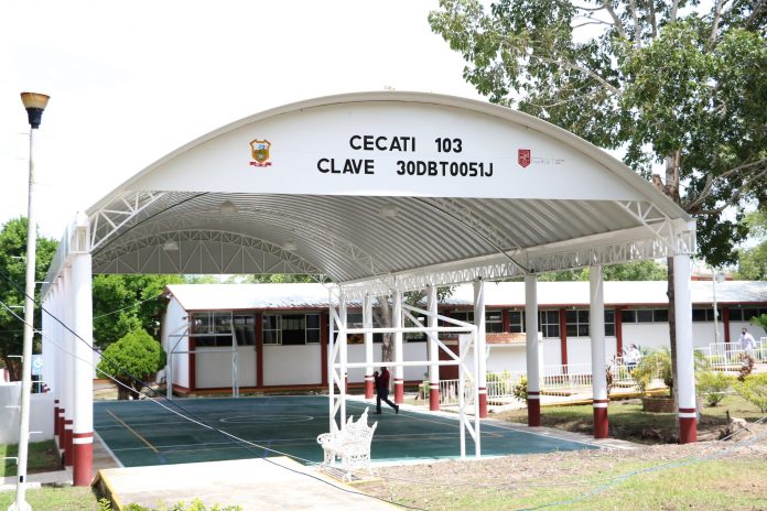 Más tarde se entregó la Construcción de Techumbre Autosoportante en la cancha de Educación Física, e Impermeabilización que se realizó en la Escuela Primaria Raúl Gibb Quintero de la Colonia 12 de Octubre, con una inversión de $ Un millón 297 mil 856.19 para 80 estudiantes beneficiados. También se entregó la Construcción de Techumbre autosoportante en el Centro de Capacitación para el Trabajo Industrial (CECATI) 103, de la colonia Revolución con una inversión de $ 914 mil 611.75, para 65 beneficiarios.