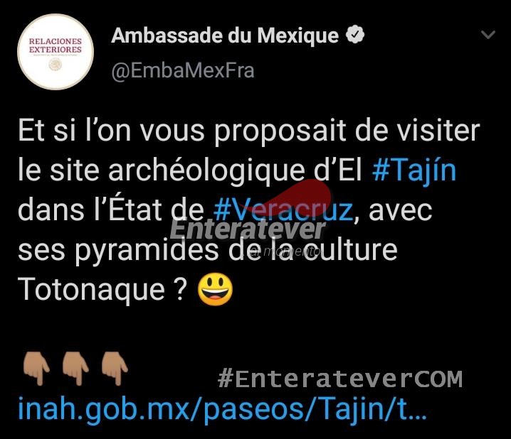 Teniendo como finalidad continuar con las promociones de los diversos destinos turísticos con los que cuenta nuestro país, la embajada de México en Francia a través de sus redes sociales ha lanzado una campaña dirigida al turismo internacional invitándolos a visitar lugares como la zona arqueológica del Tajín, ubicada en Papantla, por desgracia esta zona se encuentra cerrada.