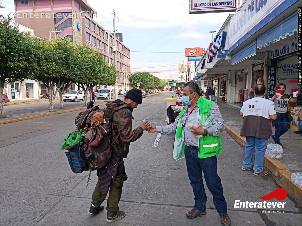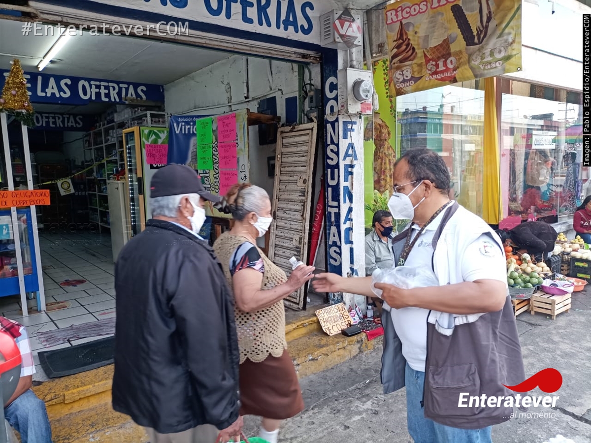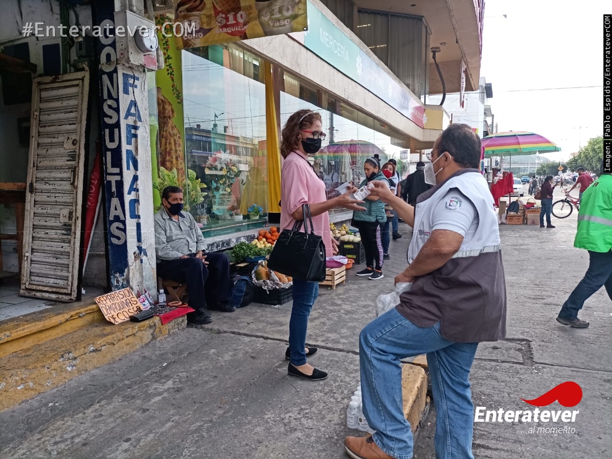 Poza Rica, Veracruz.- Personal de la Secretaría de Salud del Veracruz (Sesver) realizaron la entrega de gel antibacterial a la población que acudieron al primer cuadro de la ciudad la mañana de este martes cinco de enero, esto como parte de los trabajos para reducir el número de casos positivos en el municipio.