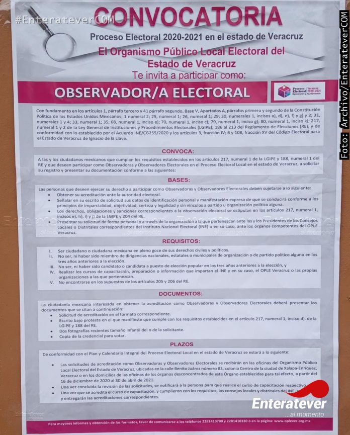 Asimismo, señaló que con el plan y calendario integral del proceso electoral local, las solicitudes de acreditación como observadoras y observadores se recibirán en las oficinas del OPLE en la ciudad de Xalapa o en los domicilios de las oficinas de los órganos desconcentrados con fecha límite el próximo 30 de abril de 2021.
