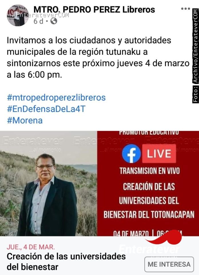 Tal es el caso de Pedro Pérez Libreros, docente de profesión en la ciudad de Papantla y quien además de que actualmente trabaja como promotor y miembro del patronato de la universidad del Bienestar en Papantla, es precandidato registrado por la alcaldía de Papantla la cual aspira, sin embargo en su peregrinar cae en el uso de asociación del programa gubernamental de universidades.