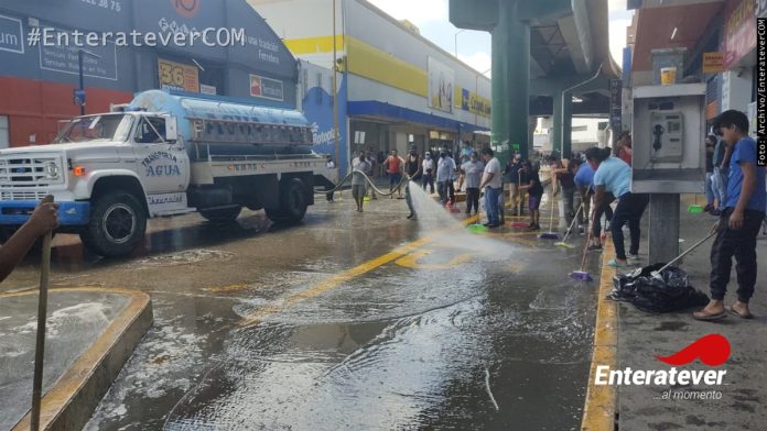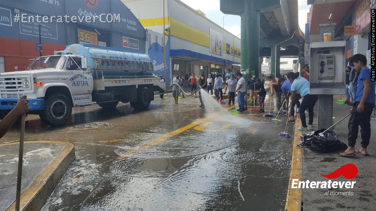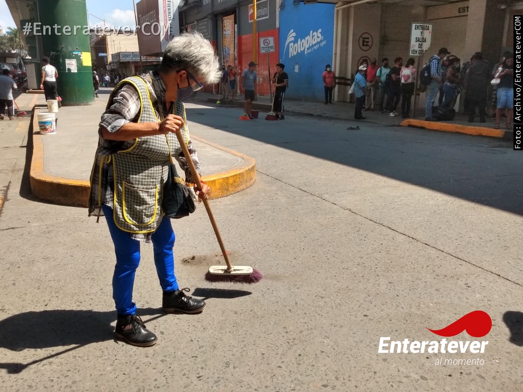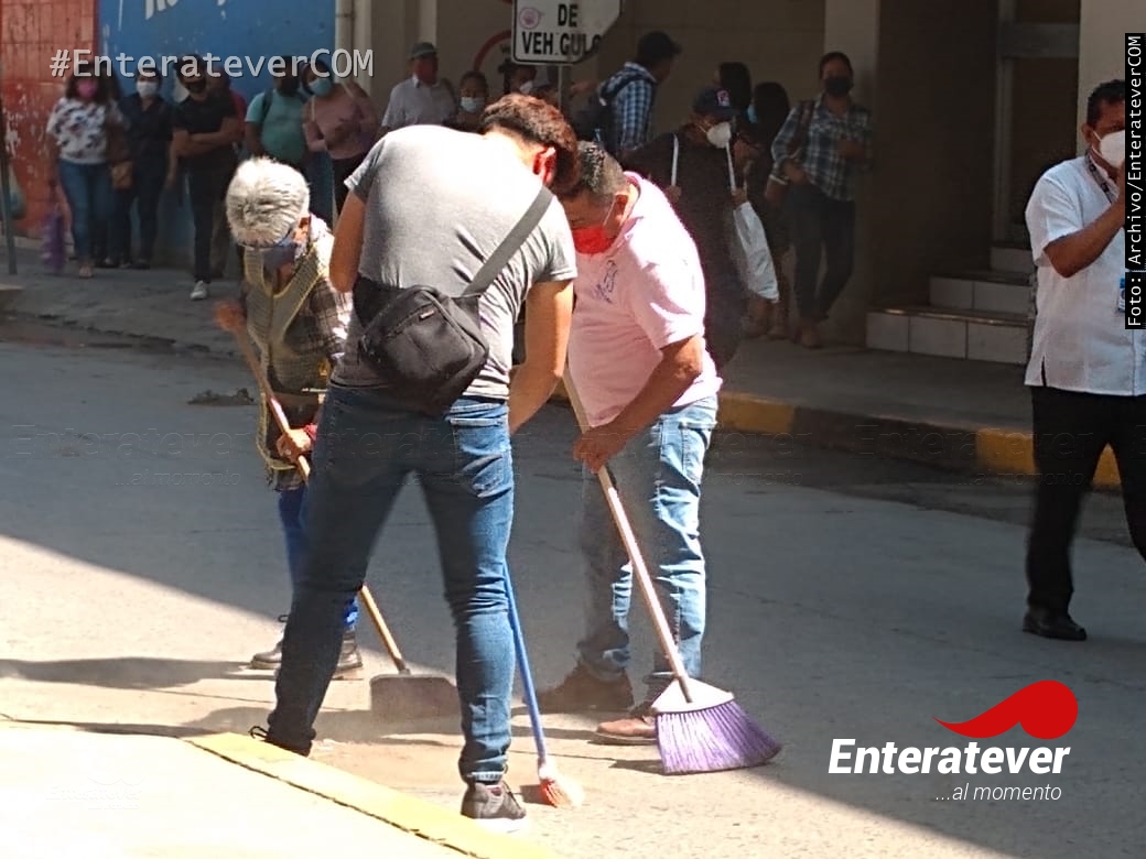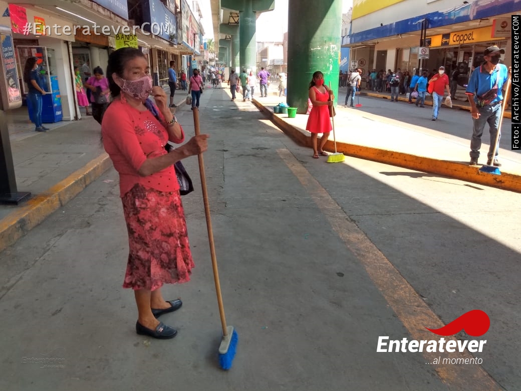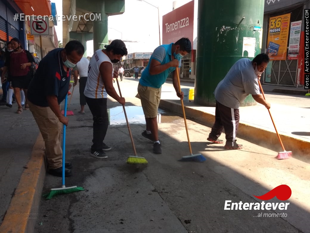 Poza Rica, Veracruz.- Comerciantes ambulantes realizaron trabajos de limpieza en el primer cuadro de la ciudad, esto con el objetivo de poder mantener limpia sus áreas de trabajo y con ello así evitar que siga incrementando el número de contagios de covid-19 en este municipio.