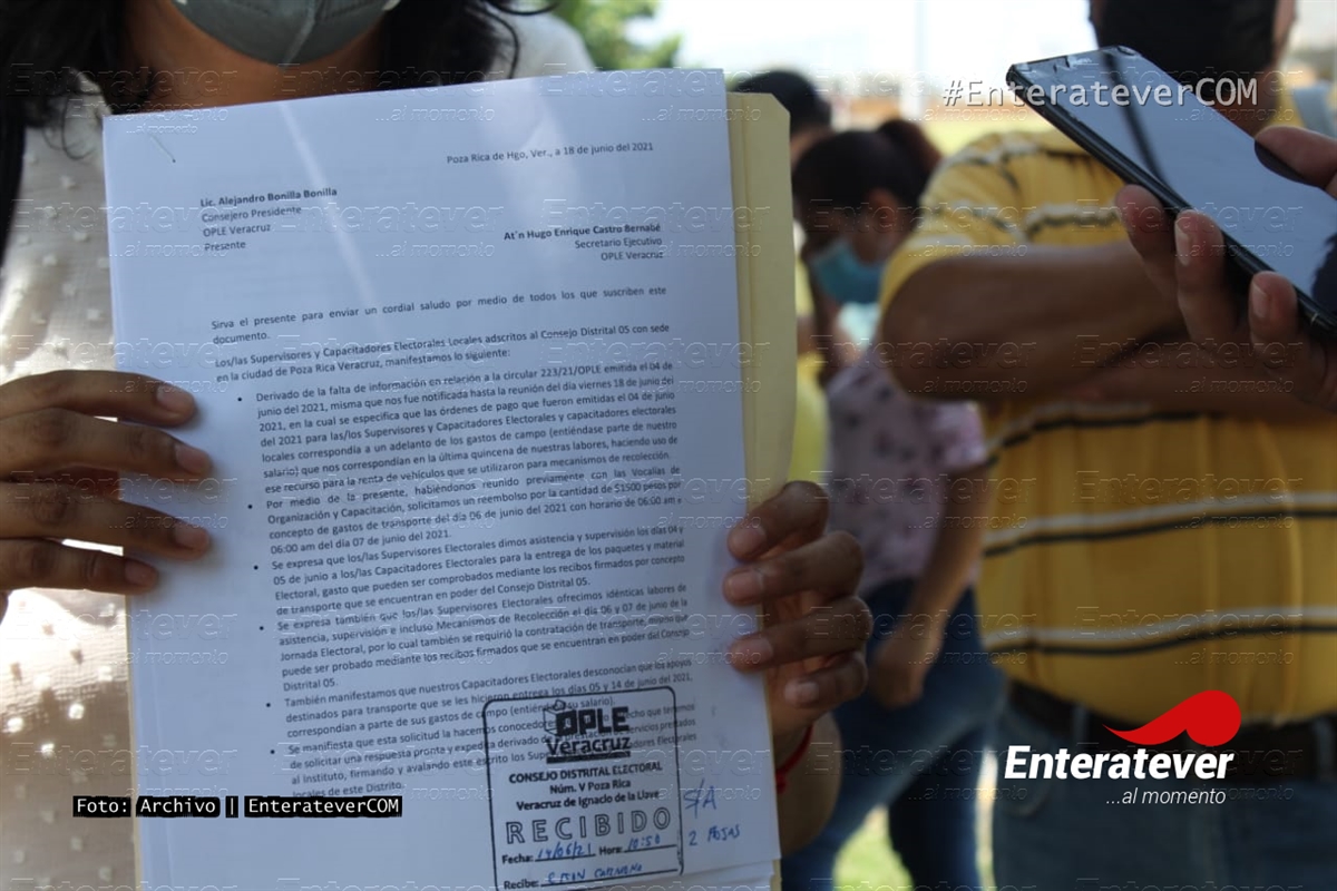 Ex trabajadores que fingían como supervisores y capacitadores electorales locales del Consejo Distrital 05 del Organismo Público Local Electoral (OPLE) con sede en Poza Rica, solicitaron el pago de sus gastos de campo que se les manejó desde un inicio de su proceso, el cual equivale a mil 500 pesos por cada uno de los 92 trabajadores electorales.