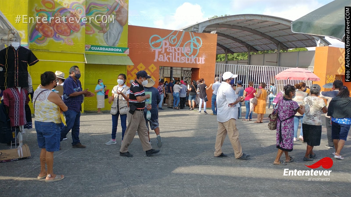 Desde temprana hora, habitantes de Papantla de edades de 50 a 59 años acuden para aplicación de la segunda dosis de vacuna Anti Covid, misma que se realiza en las instalaciones del Parque Temático Takilhsukut.
