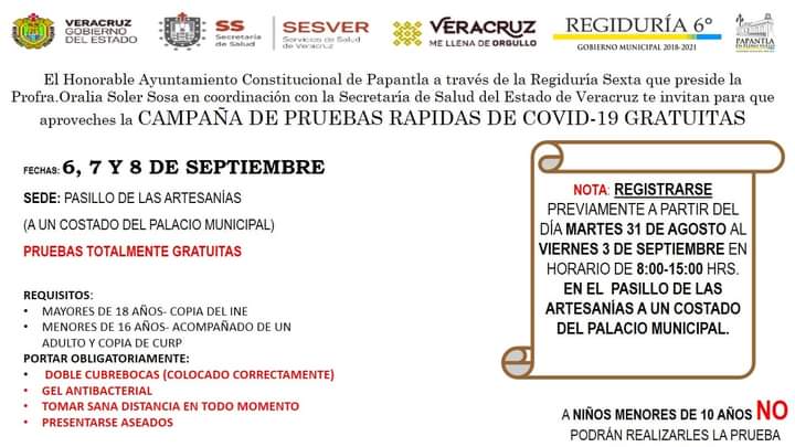 La regiduría sexta de Papantla, dió a conocer que los días 6,7 y 8 de septiembre, se estarán realizando pruebas rápidas de Covid, esto en el pasillo de artesanías de aun lado de palacio.