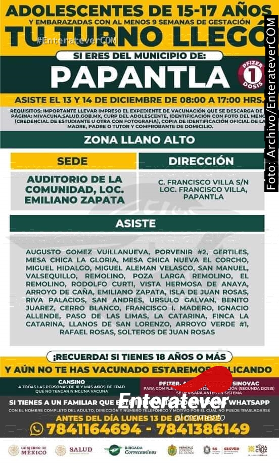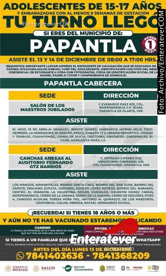 Cómo parte del proceso del programa vacunación nacional, jóvenes de 15 a 17 años del municipio de Papantla, podrán asistir para que les apliquen la vacuna contra el covid 19, la cita para los habitantes de la cabecera será en dos sedes, las canchas anexas al auditorio Fernando Gutiérrez Barrios y el salón de maestros jubilados.