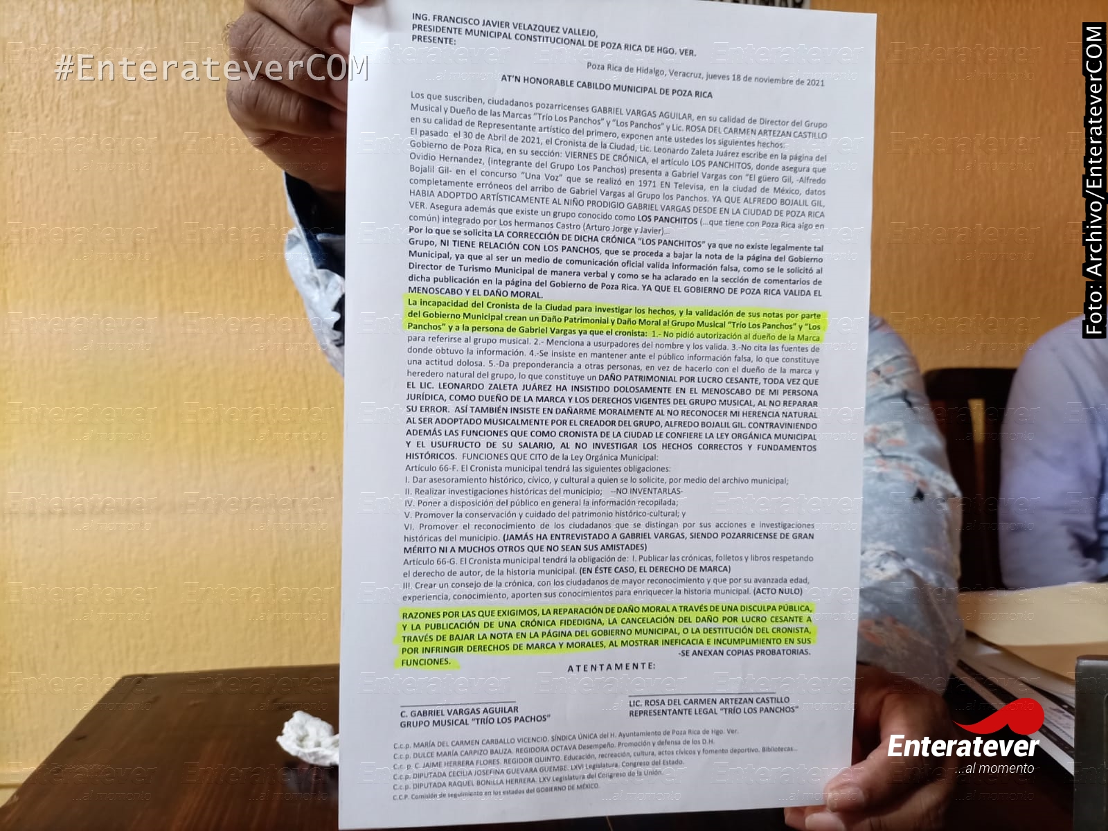 Además de que hay otras publicaciones como el caso de la crónica “Los Panchitos” en donde pone datos falsos referente al grupo musical “Trío Los Panchos”, “ Los Panchos” y a la persona de Gabriel Vargas, por lo que se iniciará un proceso legal encontrar historiador de la ciudad, por daño patrimonial y moral.