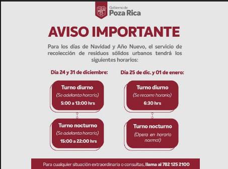 El ayuntamiento de Poza Rica dio a conocer que los horarios en lo que los carros recolectores quedarán trabajando el próximo 24, 25, 31 de diciembre y primero de enero para que la ciudadanía lo tenga presente y así evitar que calles de la ciudad se llenen de basura durante estos días.