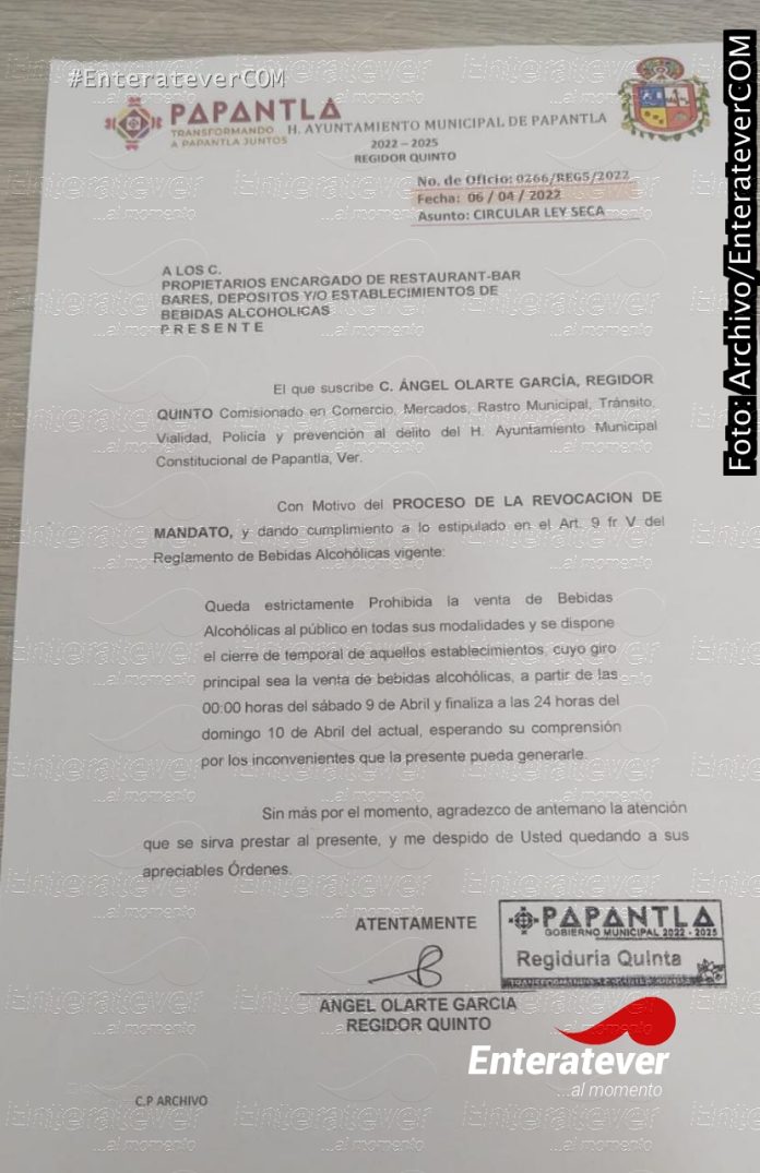 Como tal, la regiduría en el tema de comercio, encabezada por Angel Olarte García, ha girado un documento en el cual se les da a conocer a los vendedores de bebidas alcohólicas que la prohibición de este fin de semana es en base al Artículo 9 fracción V, del Reglamento de Bebidas Alcohólicas Vigente que determina se active la Ley Seca a partir de las 00:00 horas del Sábado 09 de abril.