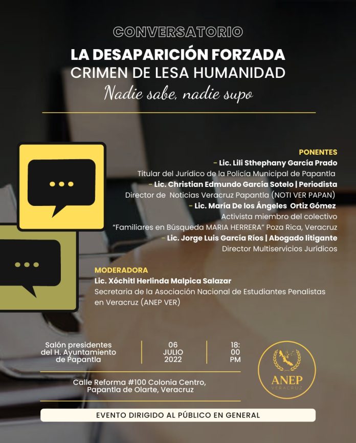 Con la finalidad de generar conciencia entre los habitantes en Papantla sobre el tema de la desaparición forzada integrantes de la Asociación Nacional de Estudiantes Penalistas en Veracruz ( ANEP VER) llevarán a cabo el conversatorio que lleva por nombre » La Desaparición Forzada, Crimen de Lesa Humanidad, Nadie Sabe Nadie Supo».
