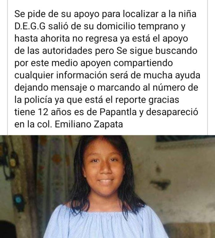 Familiares buscan a menor de doce años del municipio de Papantla, de acuerdo a la familia la niña fue vista por última vez cuando salió de su domicilio pero no regreso, aunque los hechos ya se encuentran en el conocimiento de las autoridades de seguridad la familia pide apoyo de la ciudadanía por cualquier información que pueda servir para dar con su paradero.