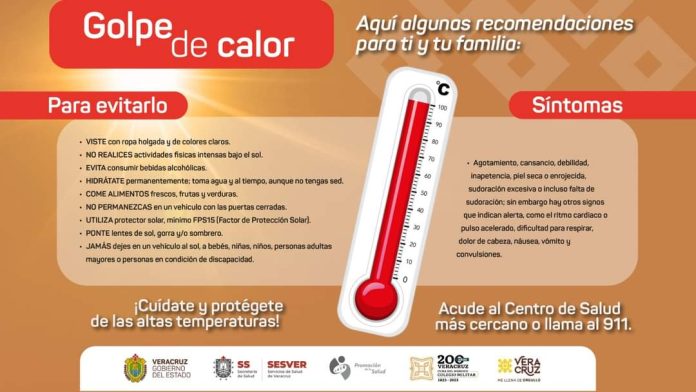 Debido a las altas temperaturas que se registran en la ciudad de Coatzacoalcos y como parte de las acciones preventivas encaminadas al bienestar social, el gobierno municipal que preside el licenciado Amado Cruz Malpica, a través de la dirección de Salud Pública exhorta a la ciudadanía a evitar los golpes calor, deshidratación y enfermedades diarreicas bajo las siguientes recomendaciones de la Secretaría de Salud.