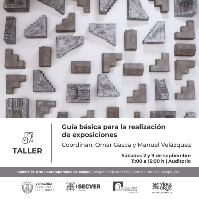 El Instituto Veracruzano de la Cultura, a través de la Galería de Arte Contemporáneo de Xalapa, invita a participar en el taller Guía básica para la realización de exposiciones. Cómo se organiza, produce y desarrolla una exposición, que será impartido por los reconocidos artistas plásticos Manuel Velázquez y Omar Gasca. La actividad tendrá lugar de manera gratuita los sábados 2 y 9 de septiembre a las 11:00 horas en el auditorio de la GACX.