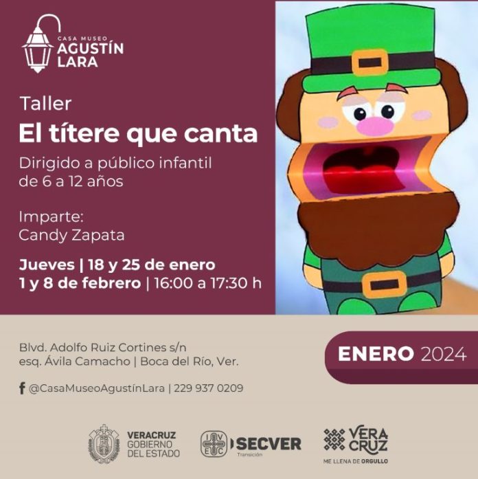 El Instituto Veracruzano de la Cultura, a través de la Casa Museo Agustín Lara, invita al público infantil a participar en el taller El títere que canta, dirigido a niñas y niños de 6 a 12 años de edad. La actividad es gratuita y será impartida por la maestra Candy Zapata los jueves del 18 de enero al 8 de febrero, en horario de 16:00 a 17:30 horas.