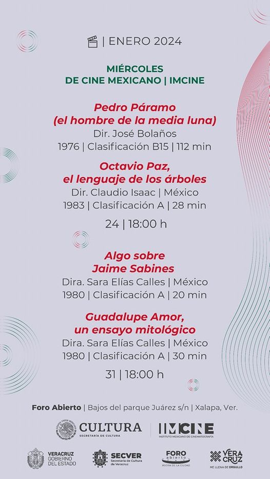 La Secretaría de Cultura de Veracruz, en colaboración con el Instituto Mexicano de Cinematografía (IMCINE), invitan a disfrutar de cuatro producciones nacionales durante los Miércoles de Cine Mexicano del mes de enero. Las proyecciones al aire libre tendrán lugar los miércoles 24 y 31, en punto de las 18:00 horas, en el foro abierto del Ágora de la Ciudad.