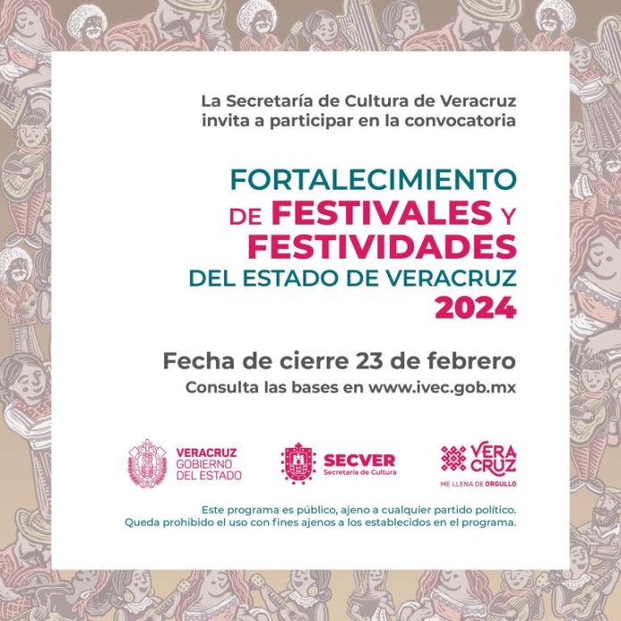 La Secretaría de Cultura de Veracruz invita a agrupaciones que lleven a cabo la organización de festivales o festividades desde la iniciativa independiente o con apoyo municipal a participar en la convocatoria Fortalecimiento de Festivales y Festividades del Estado de Veracruz, propuesta con el propósito de contribuir al desarrollo artístico y cultural de las comunidades de la entidad.