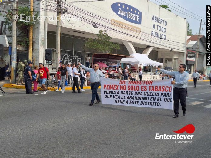 Durante el desfile conmemorativo de la Expropiación Petrolera trabajadores de Petróleos Mexicanos (Pemex) se manifestaron durante su participación, en donde destacaron la falta de medicamentos, de equipamiento y la violación a su contrato colectivo y de trabajo.