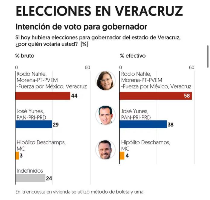 Asimismo Nahle cuenta con 58 por ciento y Yunes con 38 por ciento, una ventaja de 20 puntos. Mañana sábado está programado un debate entre la candidata y los candidatos a gobernador del estado, el cual se espera siga los tonos de otros encuentros centrados en el ataque y la crítica entre las personas que contienden. En este sentido la encuesta indica que Nahle capta 44 por ciento de las preferencias.