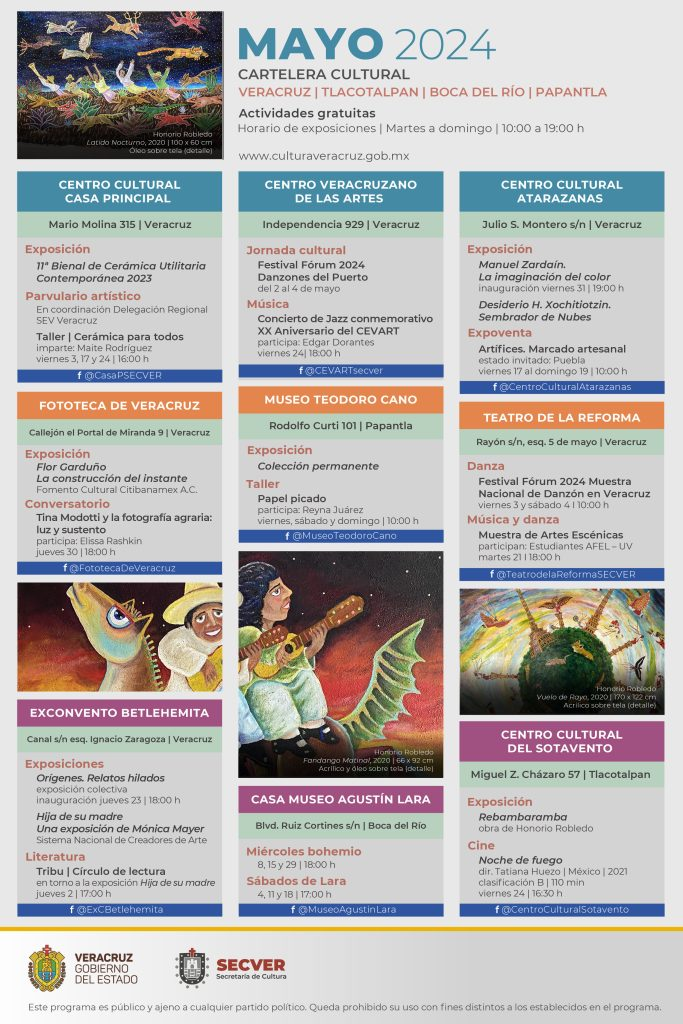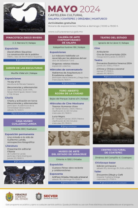 La Secretaría de Cultura de Veracruz presenta una oferta cultural diversa durante el mes de mayo, integrada por exposiciones, conversatorios, talleres, música, teatro, literatura, cine y actividades de fomento a la lectura para todos los públicos que tendrán lugar en su red de recintos culturales de Xalapa, Veracruz, Boca del Río, Coatepec, Orizaba, Papantla, Huatusco y Tlacotalpan.
