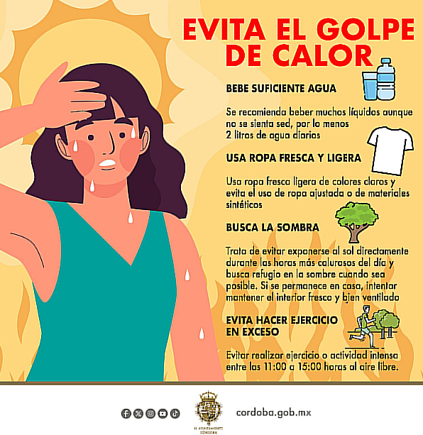 La Coordinación de Salud Municipal y de Protección Civil de Córdoba mantienen las recomendaciones a la población en general para que se protejan de la oleada de calor que ha generado altas temperaturas, se tiene previsto en la presente semana temperaturas arriba de los 38 grados con sensación térmica de hasta 42 grados centígrados.