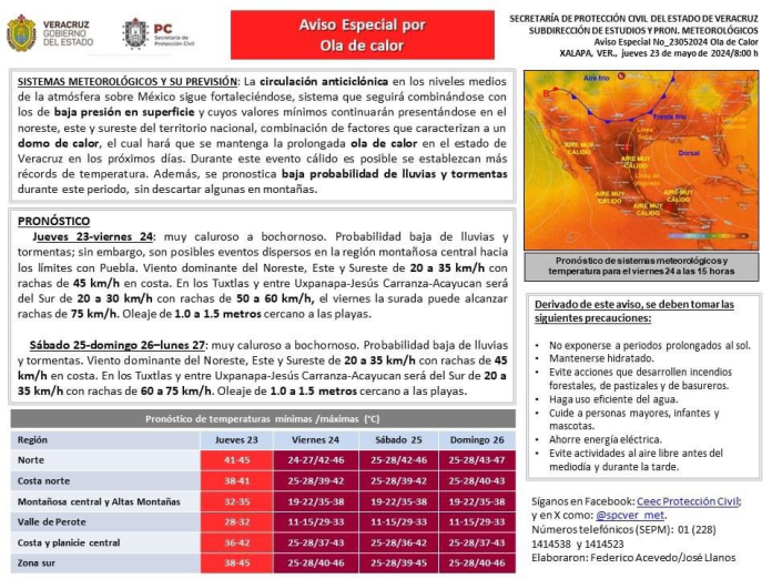 Para el jueves 23 y viernes 24 de mayo se prevé muy caluroso a bochornoso. Probabilidad baja de lluvias y tormentas; sin embargo, son posibles eventos dispersos en la región montañosa central hacia los límites con Puebla. Viento dominante del Noreste, Este y Sureste de 20 a 35 km/h con rachas de 45 km/h en costa.