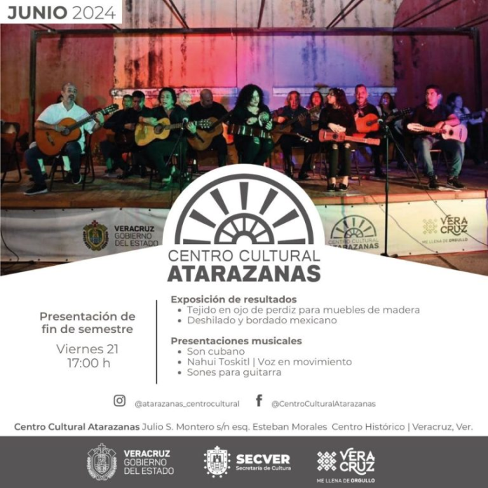 La Secretaría de Cultura de Veracruz, a través del Centro Cultural Atarazanas, invita a la presentación de fin de cursos que se realizará el viernes 21 de junio de 17:00 a 19:30 horas. La entrada es gratuita.
