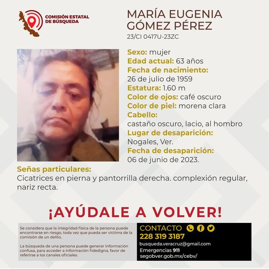 La Comisión Estatal de Búsqueda reportó la desaparición de una mujer de 65 años de edad en Nogales, Veracruz.