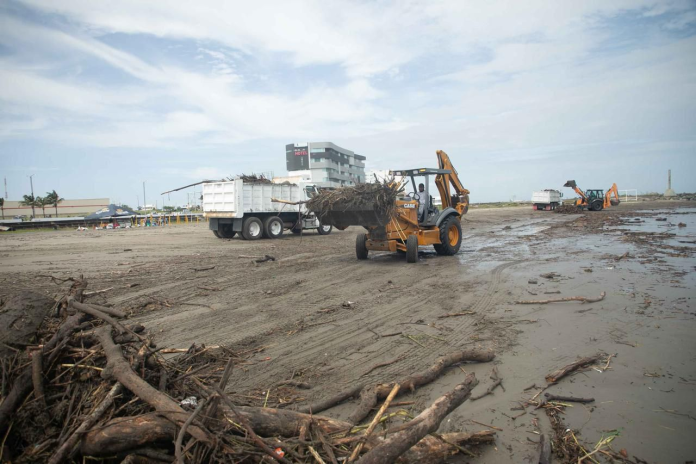 Los trabajadores municipales complementan su labor de limpieza con retroexcavadoras y camiones de volteo en los 12 kilómetros de playas para recolectar 220 toneladas de palizada diarias.