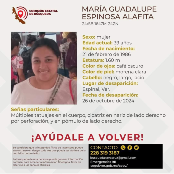 A través de una ficha informativa de la comisión estatal de búsqueda de Veracruz se pide a la ciudadanía su colaboración para localizar a María Guadalupe Espinosa Alafita, de 39 años de edad