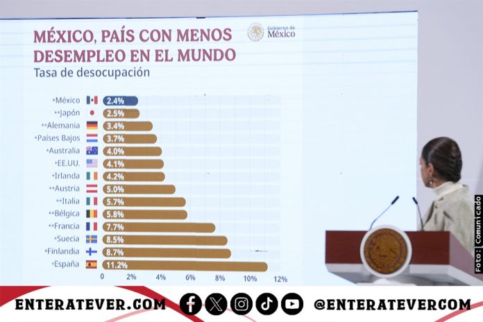 La presidenta Claudia Sheinbaum Pardo aseguró este jueves que México cuenta con la tasa de desempleo más baja del mundo y destacó que en comparación con países como Japón y Alemania, entre otros, hasta diciembre de 2024 el país se ubicó como el país como menos personas sin trabajo.