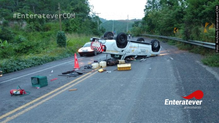 La unidad, una camioneta Mitsubishi, con placas de circulación XV-8921-A del estado de Veracruz, la cual quedó con las llantas arriba.