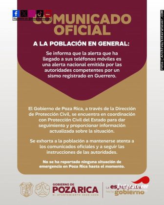 Mediante un comunicado oficial, el Gobierno de Poza Rica informó que la alerta recibida por la ciudadanía corresponde a un aviso nacional emitido por las autoridades competentes, derivado del sismo registrado en Guerrero, y aclaró que hasta el momento no se ha reportado ninguna situación de emergencia en el municipio.