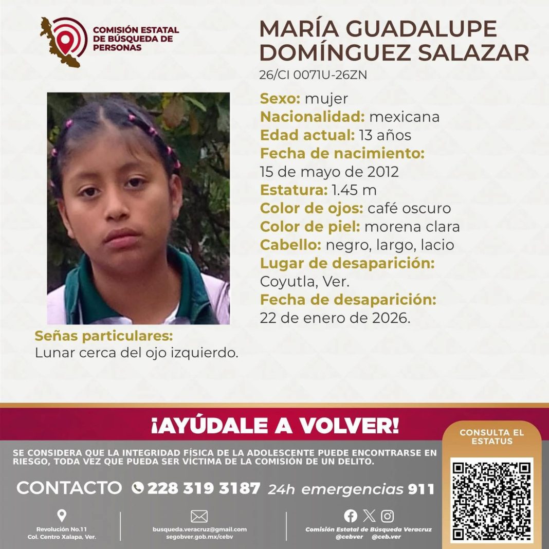 Familiares y amigos solicita la colaboración de la ciudadanía de la zona del Totonacapan para localizar a la adolescente de nombre María Guadalupe Domínguez Salazar, de quien se desconoce su paradero desde el pasado 22 de enero del 2026, razón por la cual han comenzado una intensa búsqueda.