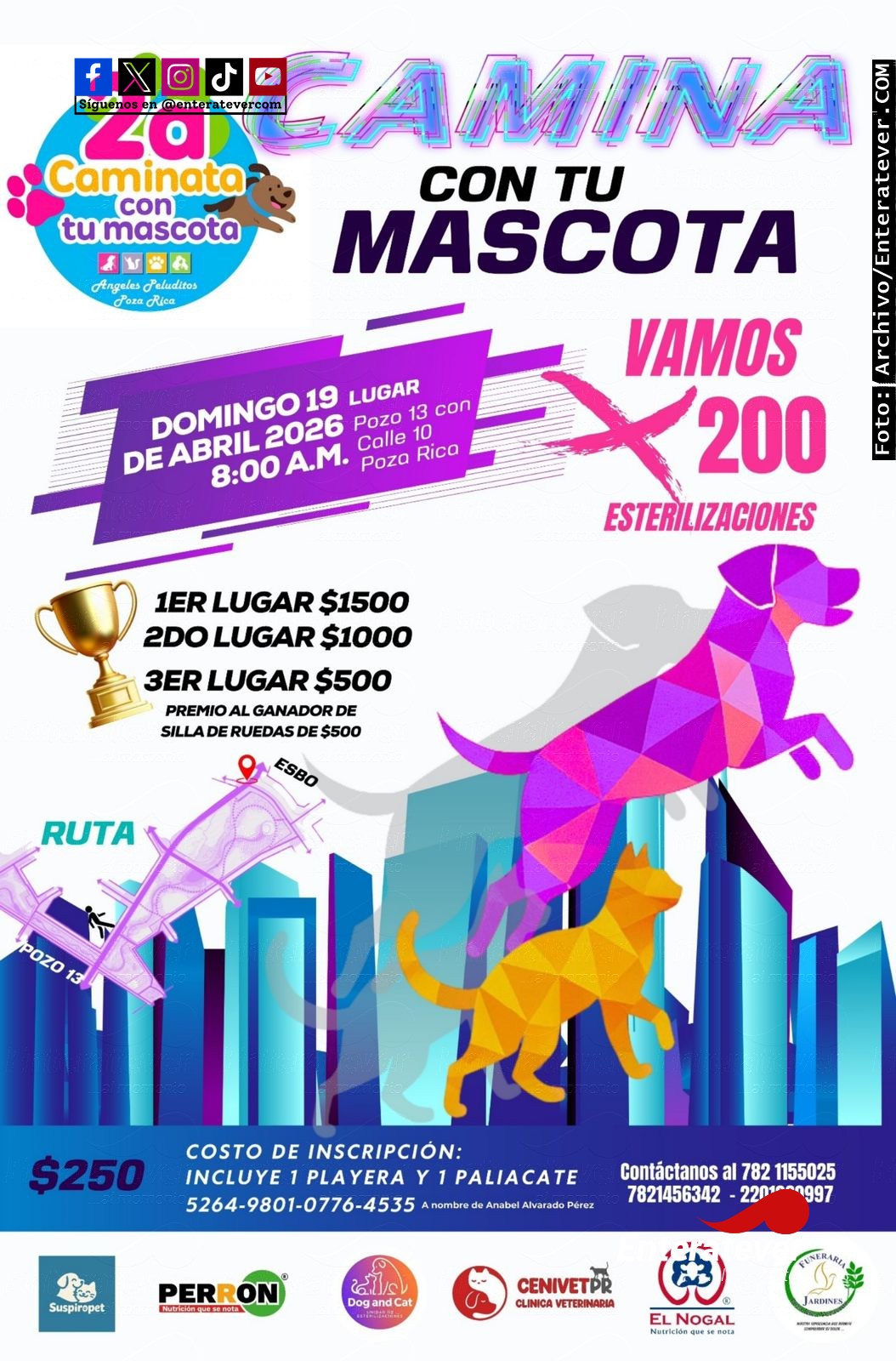 Quienes deseen participar pueden solicitar mayores informes a los números 782 115 5025, 782 145 6342 o 220 106 0997, así como realizar su inscripción mediante depósito a la cuenta 5264-9801-0776-4535 a nombre de Anabel Alvarado Pérez, contribuyendo así a una iniciativa que busca promover el bienestar animal y el apoyo comunitario.