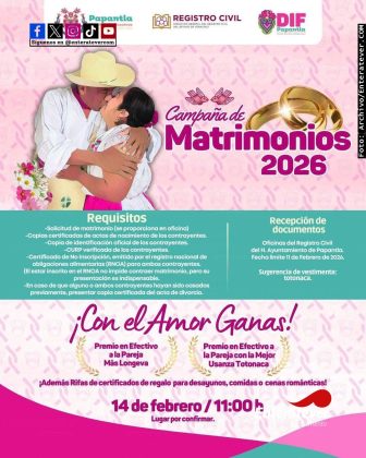 A pocos días del 14 de febrero, cientos de parejas papantecas han mostrado interés por regularizar su situación jurídica a través de la Campaña de bodas colectivas que cada año realiza el gobierno local.